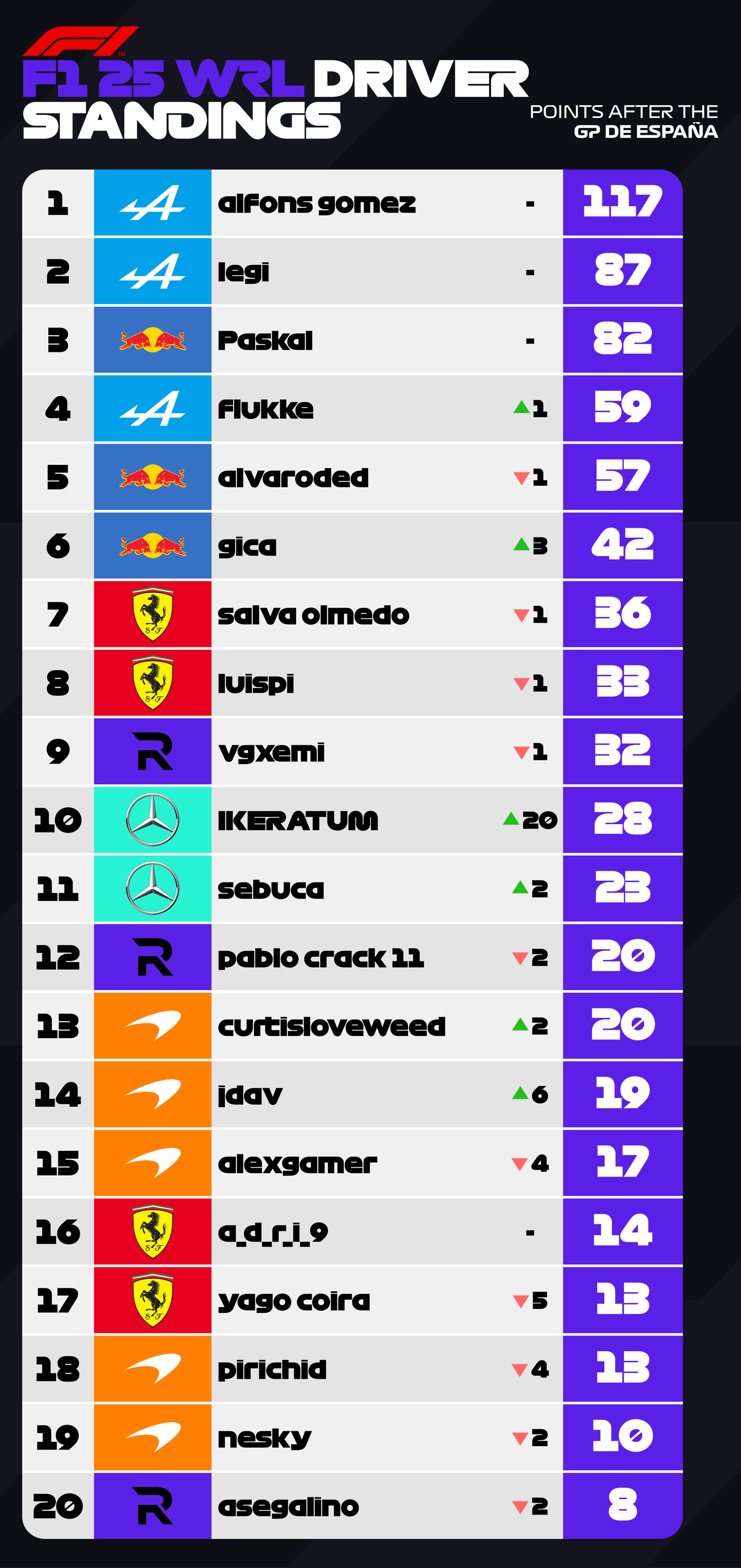 Aquí se subirán las clasificaciones tanto de F1, las cuales se irán actualizando conforme se disputen los GPs. Actualmente está la clasificación de la Temporada 3 y la clasificación de recuerdo de F2.